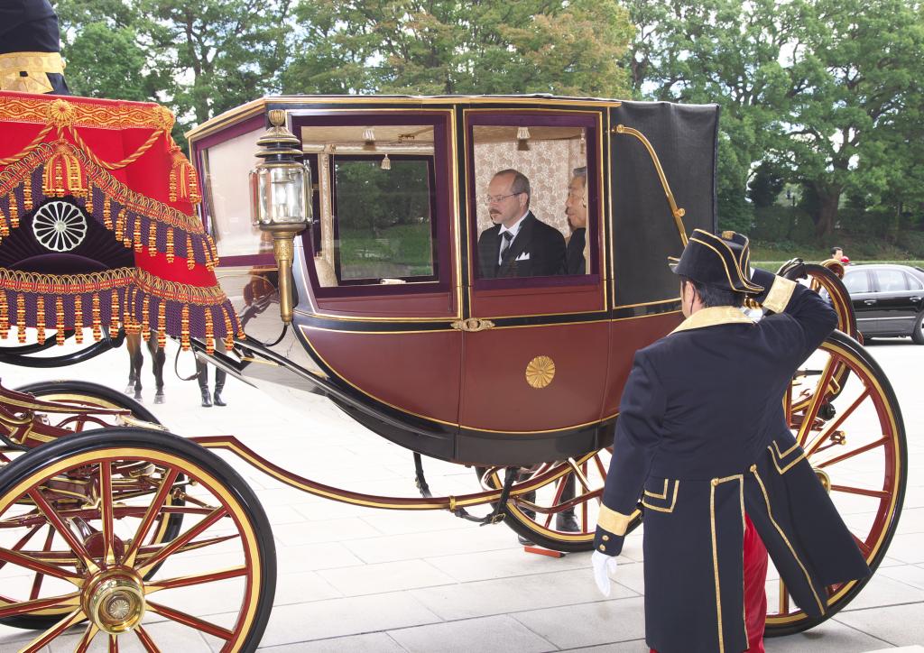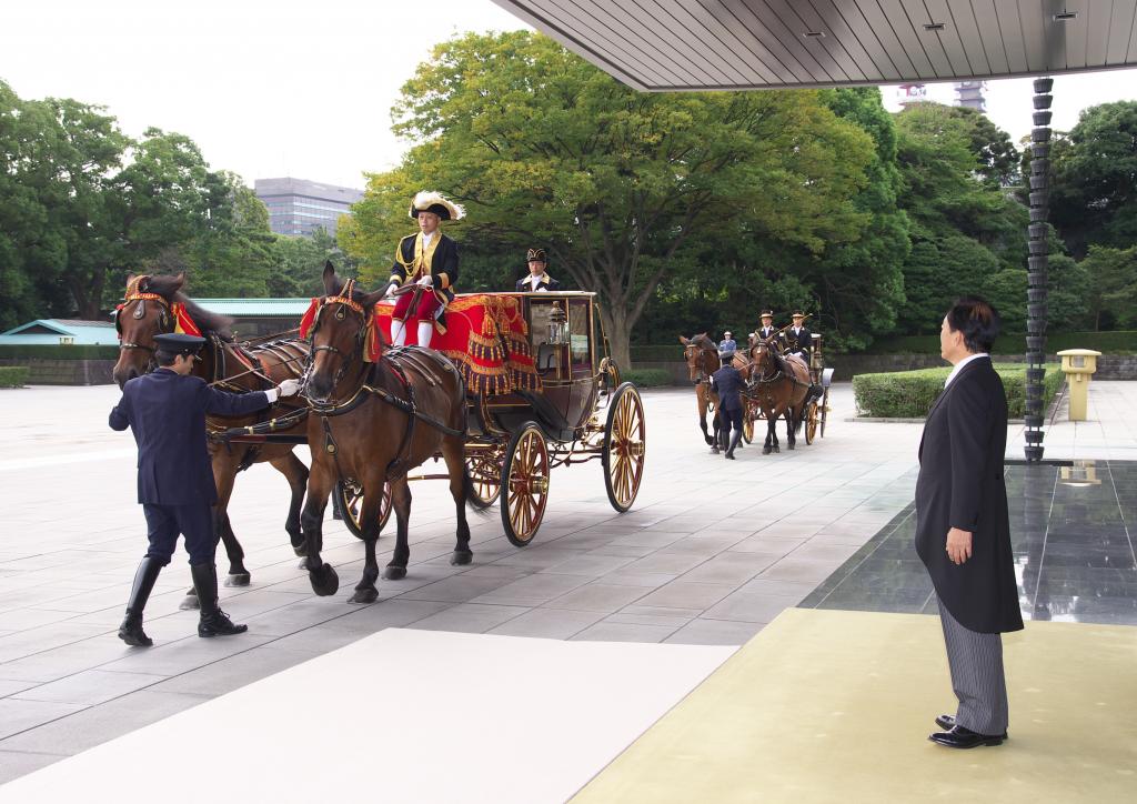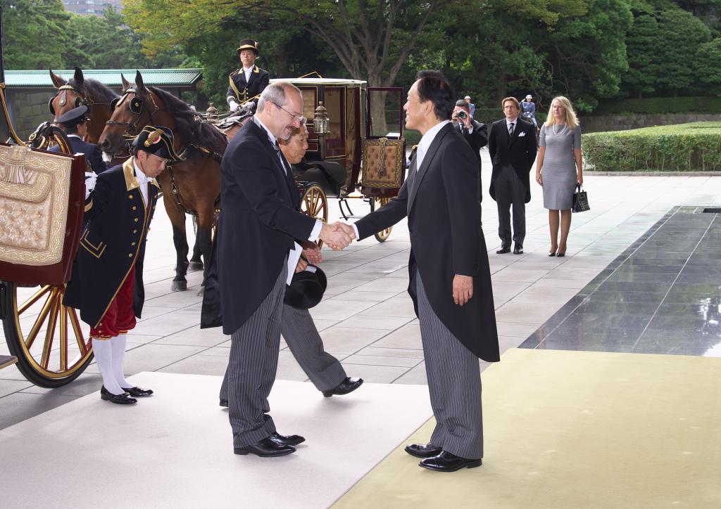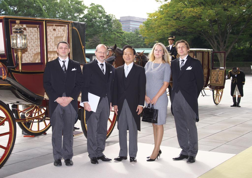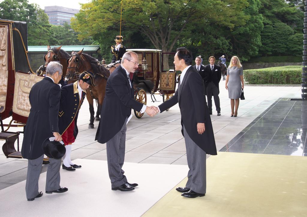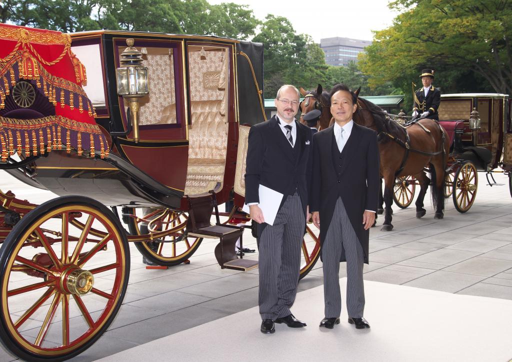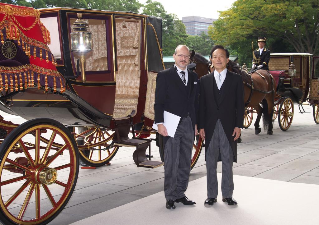 Soubou fotografií obsahuje pouze snímky z cesty do císařského paláce v Tokiu. Samotný okamžik předání pověřovacích listin byl sice též oficiálně vyfotografován, ale na přání Císařského domu nejsou tyto snímky publikovány. Japonsko je země, která je plná letitých tradic a velmi si na nich zakládá. To se promítá i při předávání pověřovacích listin velvyslanců císaři. Tak jako kdysi, po reformě Meidži, noví velvyslanci míří do paláce směrem od Tokijského nádraží (původně přijížděli vlakem), byť cesta je trochu zkrácena, aby neblokovala dopravu. Tak jako kdysi i dnes jezdí v kočáru taženém koňmi a následovaném dalším kočárem s diplomatickým doprovodem velvyslance. Jako "dress code", také tradičně, slouží velmi formální žaket, který se nosí v ranní a denní době pro příležitosti nejvyšší společenské úrovně. Kromě slavnostního okamžiku předání pověřovacích listin nový velvyslanec absolvuje i rozhovor s císařem a následně představí své kolegy z diplomatického sboru velvyslanectví. V dalších dnech je pak pozván na čaj s císařem i císařovnou.